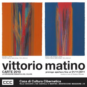 Proroga della mostra CARTE 2010 di Vittorio Matino. A seguito di richieste e in occasione della Festa di Ognissanti, si è deciso di tenere aperta la mostra fino a martedì 1 novembre. Con molta probabilità si riuscirà a fare l’ultima visita sabato 5 novembre, prima della disinstallazione dell’esposizione. Per sabato, domenica e martedì gli orari di apertura sono quelli consueti: mattino 10/12; pomeriggio 16/19.