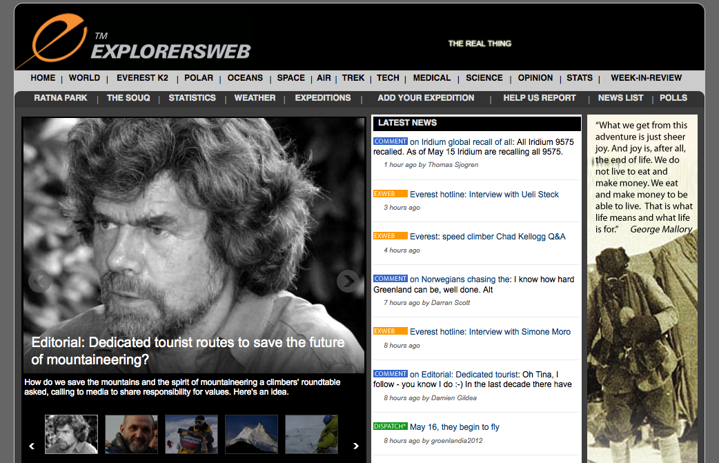 Prendiamo quindi come “curioso” segnale del nuovo corso della CCC il fatto che la redazione newyorkese di Explorersweb, il magazine digitale numero uno al mondo sull’esplorazione geografica, abbia preso come foto di copertina dei giorni scorsi una foto di Reinhold Messner ritratto durante la conferenza stampa del 3 settembre 2004 presso il giardino della nostra Libreria, futura sede dei nuovi incontri della Casa di Cultura. Non è un fatto di poco conto, sapendo che questa pagina sarà aperta da miglaia di utenti di molte nazionalità. Si tratta infatti di un editoriale scritto da Tina Sjogren sul futuro dell’alpinismo e sul rapporto conflittuale tra esplorazione e turismo. L’articolo è ancora oggi, in questi ultima decade di maggio, la cover della sezione Opinion >> http://www.explorersweb.com/opinion/ << dopo esserlo stato per il portale generale.