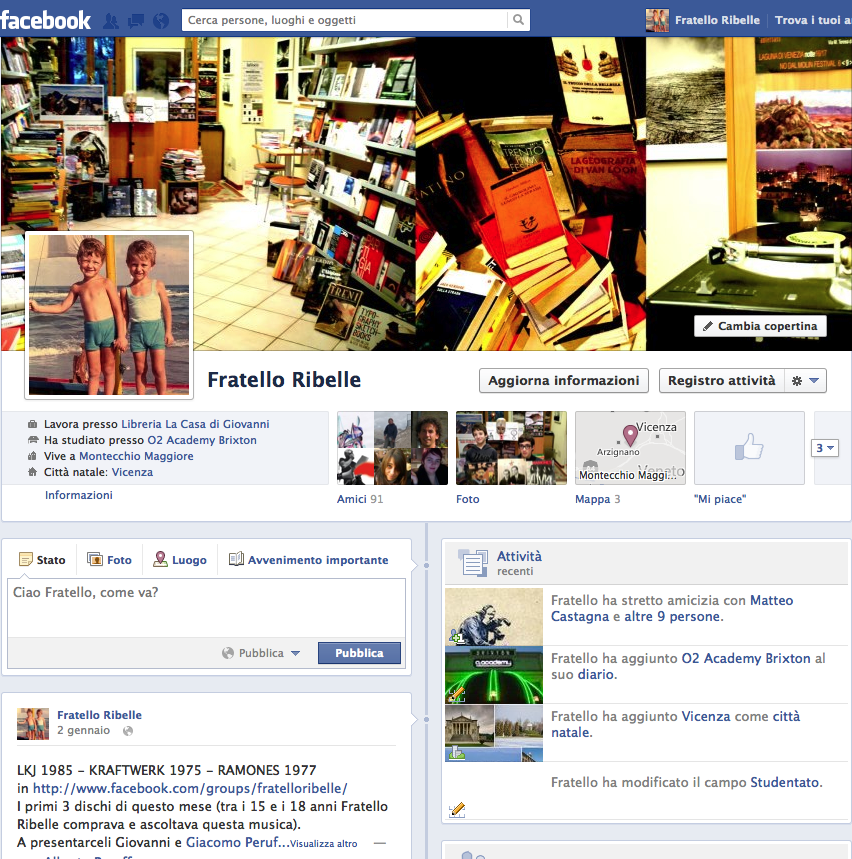 Gruppo Fratello Sorella Ribelle sono gli amici che frequentano la libreria La Casa di Giovanni, un gruppo di ascolto-lettura-condivisione-azione che ha come base il civico 41 di Corso Matteotti a Montecchio Maggiore. A guidare la condivisione Fratello Ribelle, il nuovo profilo FB creato appositamente per condividere il patrimonio discografico dei Fratelli Peruffo come stimolo all’incontro fisico presso la libreria.