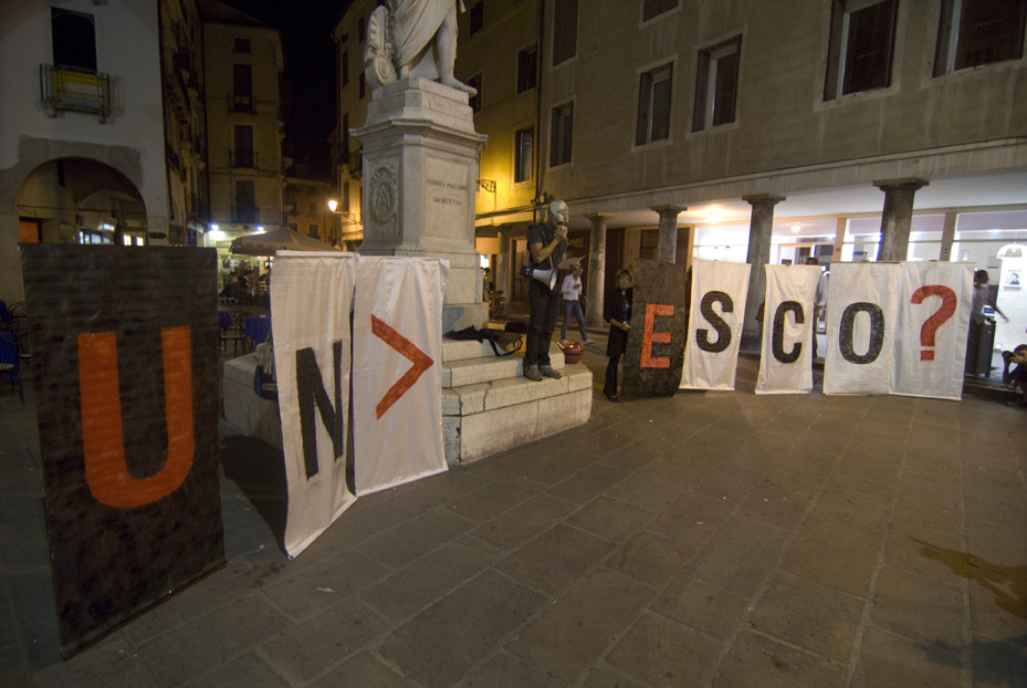 Il 150° numero del periodico nazionale ALTRAECONOMIA – mensile di informazione indipendente su economie solidali, diritti e nuovi stili di vita con redazione a Milano – dedica la copertina e il dossier principale alla situazione dei SITI UNESCO italiani a rischio di uscita dalla World Heritage List, ispirandosi alle azioni di Vicenza. La parte principale dell’articolo e il titolo sono infatti chiaramente centrati su VICENZA, ripercorrendo tutta l’«agitazione culturale» messa in moto da Alberto Peruffo e compagni dal 2007 ad oggi, a partire dall’Istanza Vicenza Out of Unesco e The Wandering Cemetery – ricordiamo il momento centrale con il Triste Palladio Fumante, dove si giocò per la prima volta con l’anagramma ESCO-UN-ESCO – fino all’azione VICENZA. PATRIMONIO VERGOGNOSO DELL’UNESCO.
