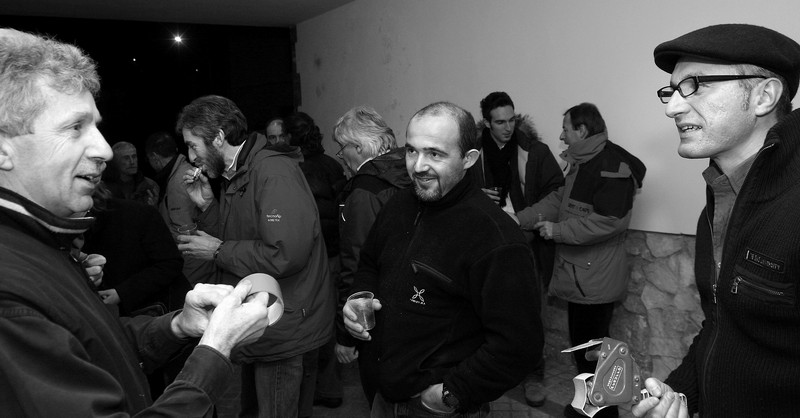 Lorenzo, Claudio Chenet e Alberto discutono di protezioni alternative... Dietro si intravedono diversi amici: Ettore De Biasio, Gabriele Villa, Claudio Tonello, Alberto Urbani, Pierino Radin, etc... nel retro della libreria La Casa di Giovanni nel pre-serata Canneti | Foto di Alessandro Pianalto