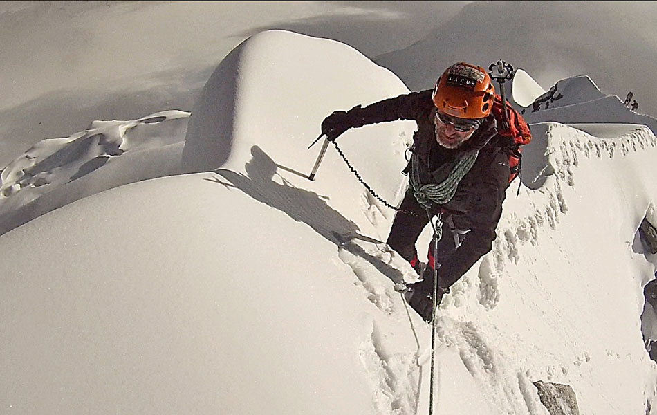 Alberto Peruffo in un fotogramma della GoPro installata sul casco del compagno di cordata Francesco Canale, durante la prima salita della Cima Nord delle Tre Cime del Simvo. In lontananza la cordata Cesar Rosales e Davide Ferro