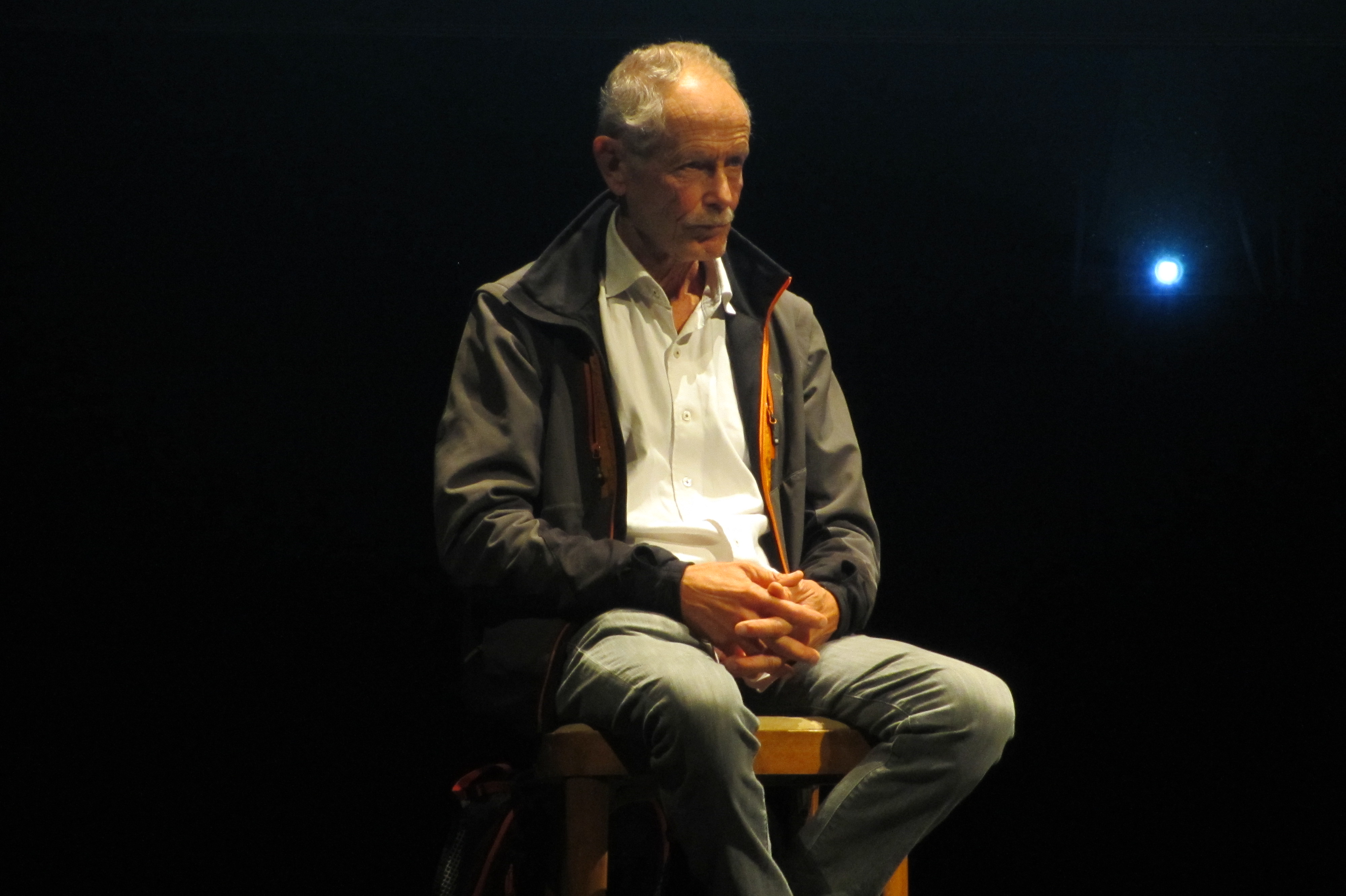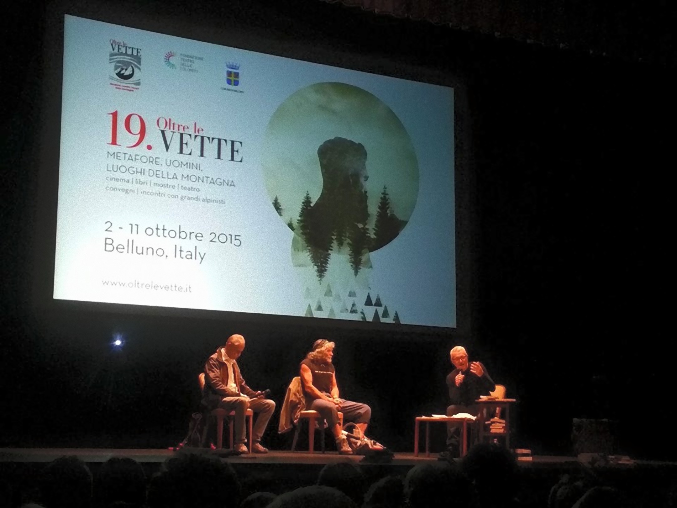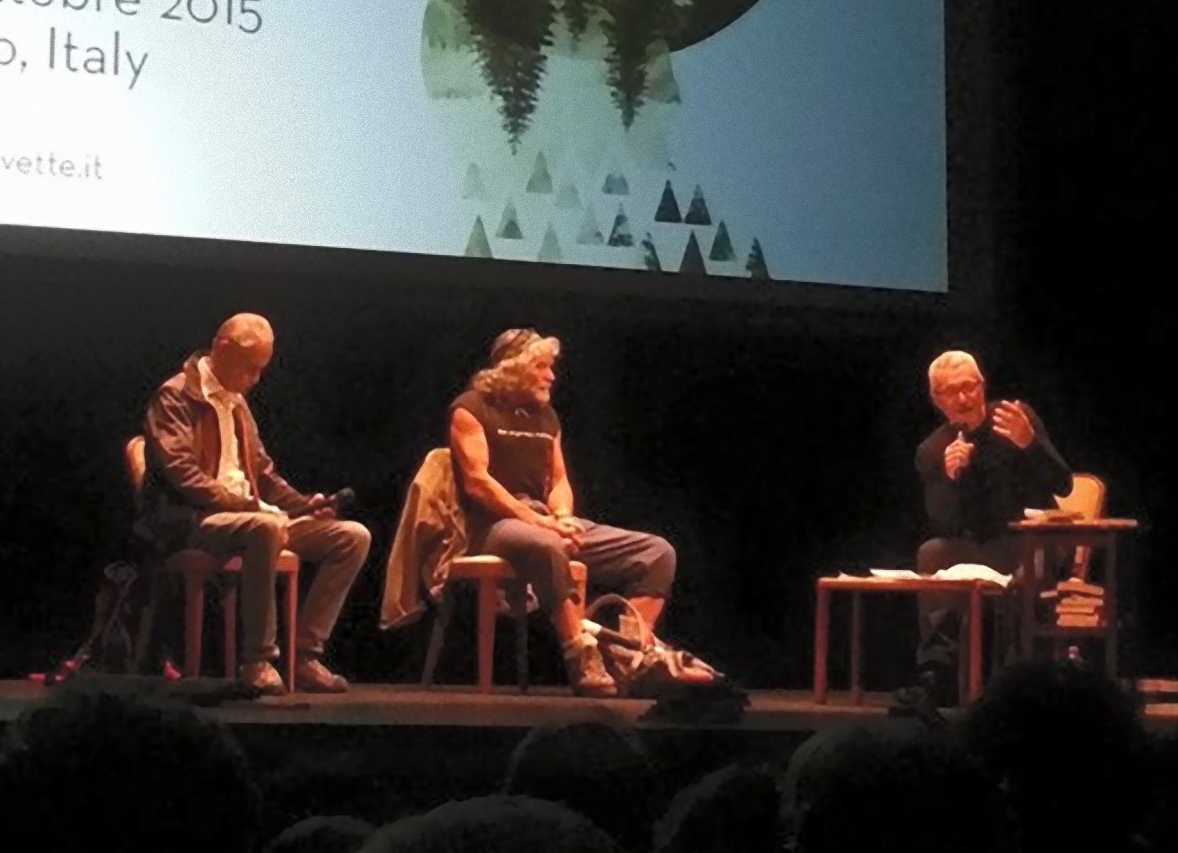 La sera, poi, con il Teatro Comunale zeppo di gente, a film concluso, dove nessuno si alzava, d’accordo con Erri e Mauro di non prendere la scena a proiezione finita, sono stato obbligato dal “sentimento della sala” a salire, almeno noi, io e Flavio Faoro, direttore artistico di Oltre le vette, per un saluto. Di fronte alla poesia del film e dopo il duro (per me) incontro del pomeriggio, non sono riuscito a dire altro che una sola parola: “Erri”, indicandolo con il braccio teso, giù in platea, e di concerto, Flavio, molto bravo, ha detto “Mauro”. Mauro ed Erri si sono alzati in piedi tra lo scrosciare sincero degli applausi del pubblico, che finalmente usciva dall’apnea del film e infine Flavio, per mia fortuna, e involontaria assenza, ha salutato tutti.