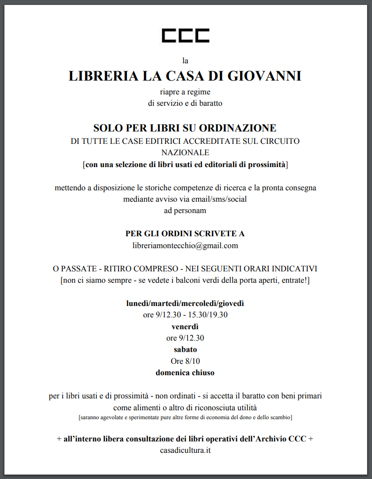 «È il momento giusto. Di fare un nuovo esperimento, un vero e proprio nuovo atto politico. Nel senso pieno del termine. Di riaprire, o meglio, riconfigurare, le relazioni di prossimità. In paese. Nel pagense. Il “cippo di confine fissato in terra” dicevano i Latini. Dove vivo. La nostra libreria è sempre stata – anche in modalità fantasma – una libreria di relazioni, non tanto di libri morti o semplicemente vendibili. D’altra parte, cosa sono i libri – quelli che resistono al tempo – se non voci che non muoiono mai. Fantasmi del nostro pensiero. Che riemergono al tatto della nostra attenzione. Ognuno di noi ha questa facoltà. Di aprire la porta, la bocca, o un libro. In questi mesi sono usciti molti libri di amici montecchiani – Michele, Jury, le Elise, Giovanni, Madda, la quale ha fatto recentemente un laboratorio qui da me con il compianto prof. Livio Sossi (v. foto sopra) – oltre al mio. Libro piuttosto discusso e non facilmente trovabile. Sono quasi esaurite le scorte della prima edizione. È giusto che ci sia un luogo pertinente dove trovarli. Questi libri. Un servizio alla cittadinanza. Come la possibilità di ordinare ad personam – la ricerca è stata sempre il nostro forte – o di trovare altri libri di prossimità, dove con questo termine voglio sottolineare autori, editori, amici che da anni collaborano con noi e in qualche modo sostengono il mio difficile lavoro di “attivatore” culturale. Specie dopo le ultime lotte territoriali, che ci hanno prosciugato forze ed energie. Anche per aggiornare su queste, sui “processi” in corso, nella doppia accezione. Siamo addirittura in partenza per la Corte Europea, con i Pfas, dopo aver curato la partenza dei processi di Vicenza ed essere coinvolti a doppia mandata contro i responsabili e corresponsabili del caso PFAS-Miteni. Cosa faremo? Riattiveremo SOLO il servizio originario di ORDINE LIBRI, tuttavia con qualche novità. Nessuna esposizione di libri commerciabili del circuito librario di vendita (questi si possono trovare a Schio). Esposti si troveranno solo i libri operativi dei nostri archivi, alcuni davvero importanti e introvabili. Fuori da qualsiasi mercato-mercato. I libri esposti si potranno consultare ed eventualmente ordinare, se possibile. Una specie di museo, parlante. Dove le domande – non solo sui libri, ma sul territorio – trovano risposte. Allo stesso tempo terremo una piccola selezione di libri usati di indubbio valore culturale. Anzi, invito gli amici stessi a portarcene. Adotteremo inoltre la pratica del BARATTO per scambiare senza denaro questo genere di libri o altro. Per rompere più o meno simbolicamente una pratica che la contemporaneità ha reso insostenibile: quella del denaro divenuto merce, senza fondamento. Una bottiglia di vino, di olio, una cassa di mele o di verdure di stagione, un chilo di pasta o di non-so-che, come un abbraccio di una persona che non si vede da tempo, in cambio di un buon libro. Alimentazione di tipo differente, ma essenziale alla nostra salubrità, anche mentale. Quel che ci manca infatti oggi sono soprattutto le facoltà critiche e di amicizia, di vicinanza, di sentirsi appartenenti a una comunità, non a una «pubblicità». Questo ci manca, più che gli alimenti “alimentari”. La comprensione delle categorie pubblico/comune, il loro conflitto, alimentano infatti buona parte dell’elaborazione teorica che spero presto uscirà da questi muri che hanno respirato la presenza e il passaggio di intelligenze e amicizie straordinarie. Qui da noi coltiviamo e selezioniamo – segretamente, nelle secrete stanze – quel genere di cibo speciale e immateriale, di difficile gestione… tanto esso è – e deve restare sempre – insubordinato. Inconfezionato. Introdurlo di nuovo – valorizzato da queste forme di economie diverse, suggerendole, declinandole ai fatti dei nostri territori, non proprio felici – è dunque un atto politico. Un’intrusione di democrazia – la voce degli altri – che entra nei corpi, per renderli attivi, vivaci, incontrollabili, diversamente civili, nel senso di portatori di semi di una civis-civiltà che deve cambiare, la civiltà che manca nelle nostre città. Addomesticate. Addormentate. Manipolate. Chiuse in se stesse. Tradite dalla tradizione. Con terra, acqua e aria, i beni comuni primari, contaminati. Passate a trovarci. Se vedete i balconi aperti, aprite la porta: entrerete in un luogo che molti hanno definito magico. Lo credo anch’io. Con qualche difficoltà. Ciao».