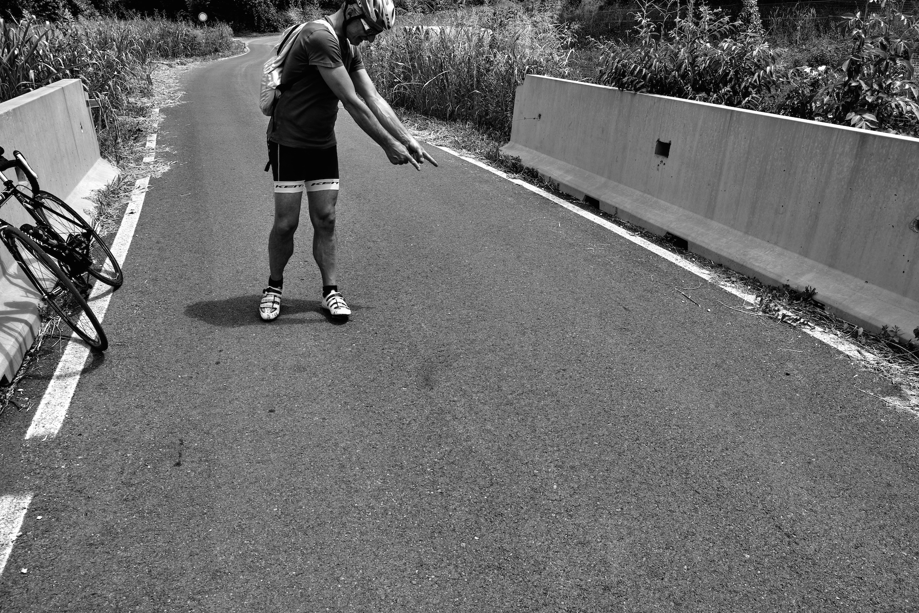 Siamo esploratori in terra straniera. Ci inoltriamo in questo rettilineo costeggiato da capannoni occupati, occupanti o abbandonati, con le nostre bici, in una dimensione che non è nostra. Incrociamo sguardi sorpresi, che in qualche modo ci rendono indifferenti, appunto estranei a questo contesto. La zona industriale per definizione non è luogo ciclistico, tanto meno per ciclisti a passo d’uomo con la macchina fotografica in mano. Ma l’entrarci con un mezzo non idoneo, rende l’esplorazione efficace, per rilevare visioni che dall’auto non si potrebbero produrre. Sembra tutto in trasformazione.