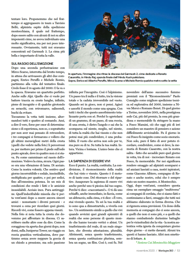 Il numero di novembre 2020 di Montagne360 – “la rivista del Club Alpino Italiano dal 1882” – uno dei magazine più diffusi d’Italia (207.000 copie la tiratura di questo numero) – dedica ampio spazio al lavoro culturale di Alberto Peruffo. Nella sezione STORIA pubblica il racconto/ricordo della salita al Garmush 2 (Renato Casarotto Kor, dedicata al grande alpinista vicentino) durante la Spedizione Chiantar 2000, ai confini tra Pakistan e Afghanistan. Qui sotto le due pagine dell’articolo.