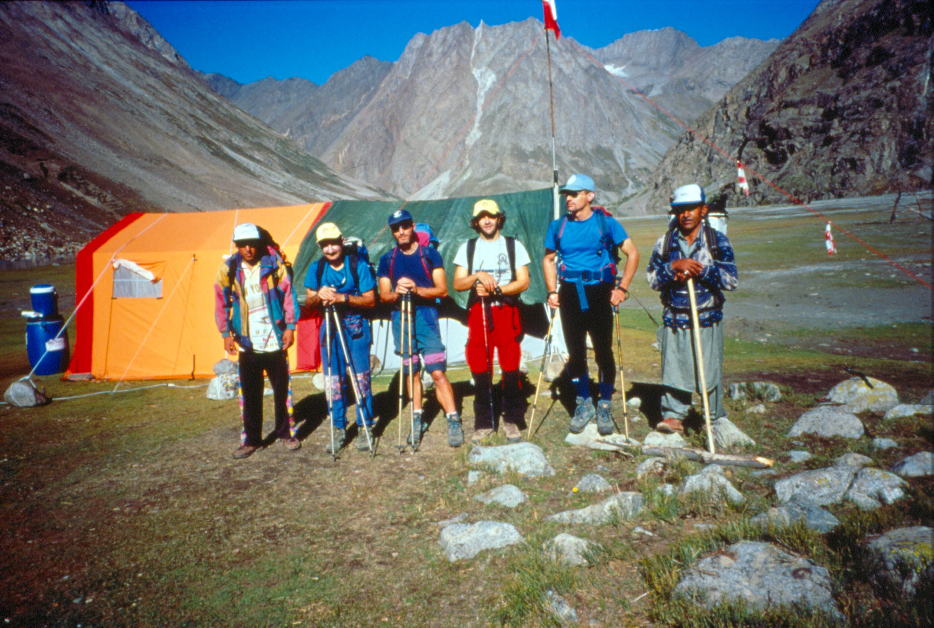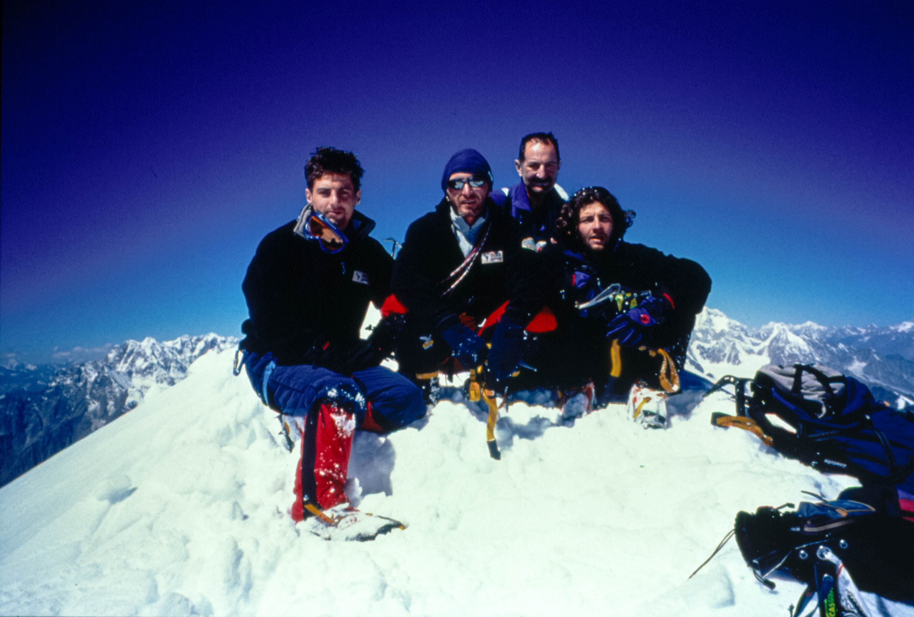 Nella prima foto ci vede appena sotto la vetta, tanto era piccola e aguzza, Enrico Peruffo, il sottoscritto, Mirco Scarso e Michele Romio. Nella seconda Michele durante la salita (sullo sfondo il Colle Chantal dove la settimana prima io, Mirco Scarso e Tarcisio Bellò salimmo due importanti cime, sempre sui seimila metri). Nella terza, il sottoscritto che inizia la discesa della lunga cresta che intuite sotto i nostri piedi. Nella quarta Garmush 2 e Garmush 1 visti da Nikolajewka Kor (sopra il Colle Chantal citato prima). Nella quinta, noi quattro al Campo Base del Lago Atar, più i nostri due high porters pakistani, prima di partire per il campo base avanzato, dove ci hanno accompagnato. La sesta, ultima, bellissima, foto che ha ispirato la spedizione: si vedono le impressionanti pareti glaciali del Garmush 2 e Garmush 1 (i versanti opposti sono soprattutto rocciosi) viste dalla Spedizione Karambar 1997, guidata sempre da Brunello e Chilese.