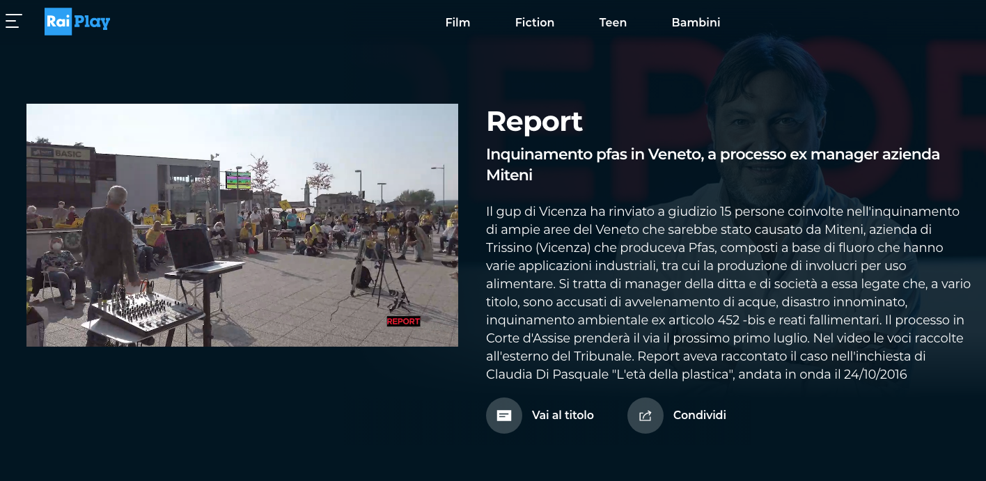 >> https://www.raiplay.it/video/2021/04/Inquinamento-pfas-in-Veneto-a-processo-manager-azienda-Miteni-6830a351-42f7-486e-b39f-3bbe5f6b5143.html