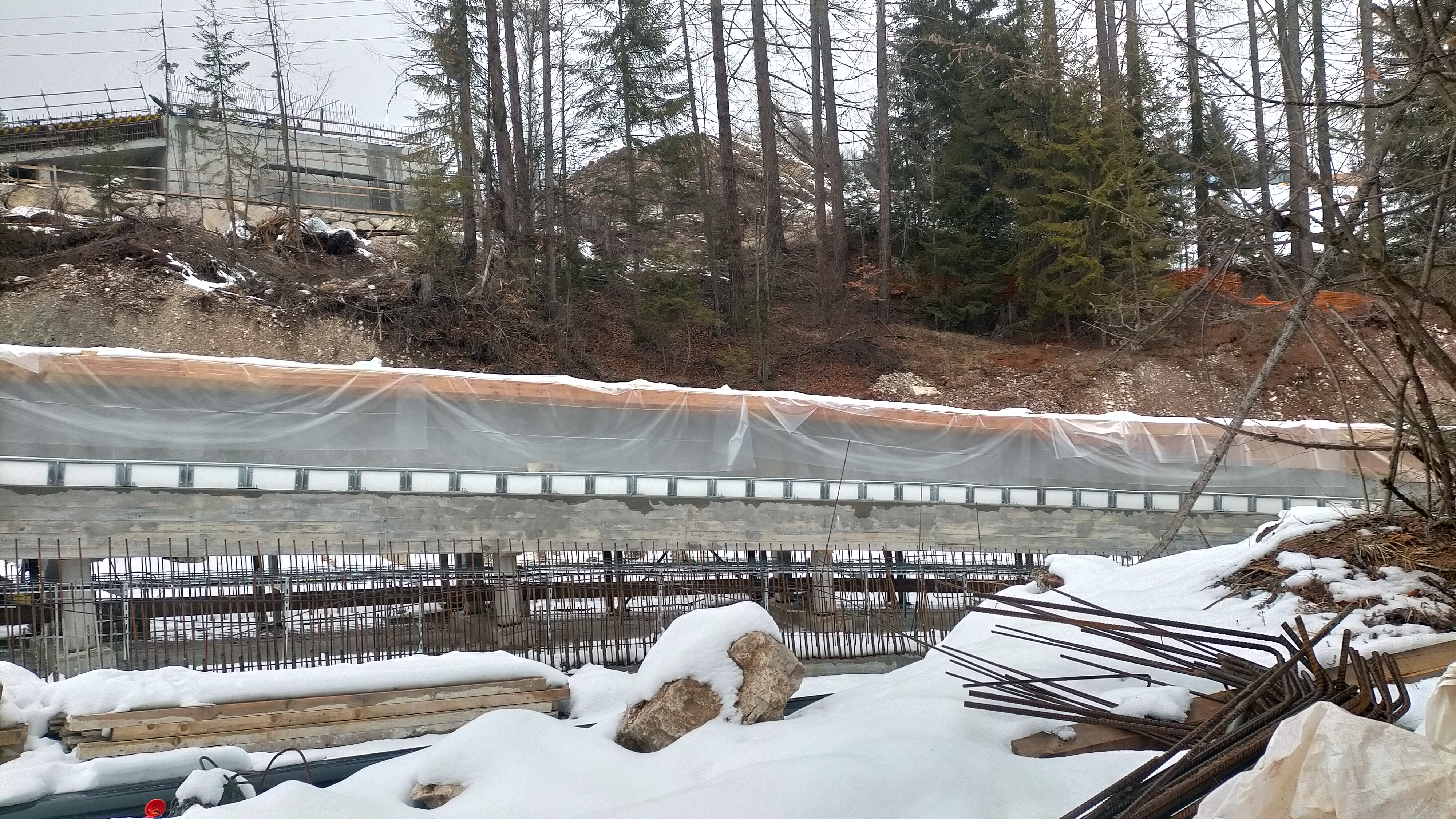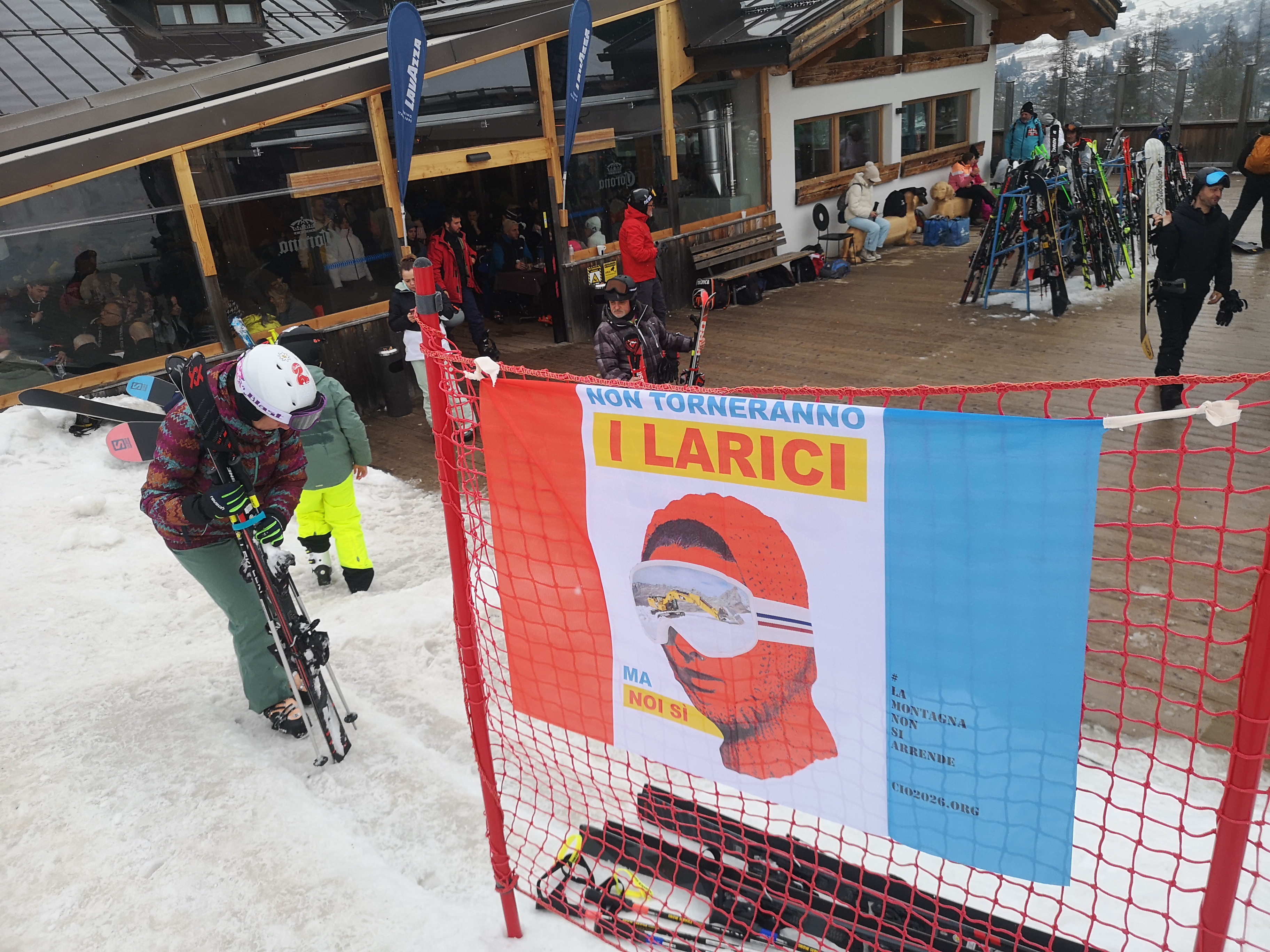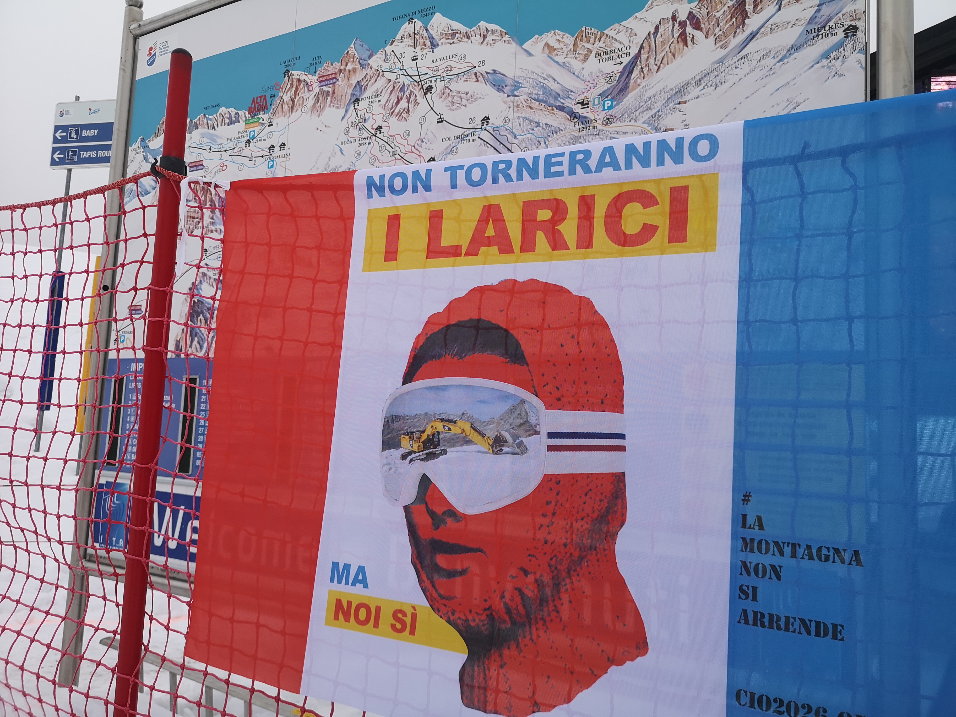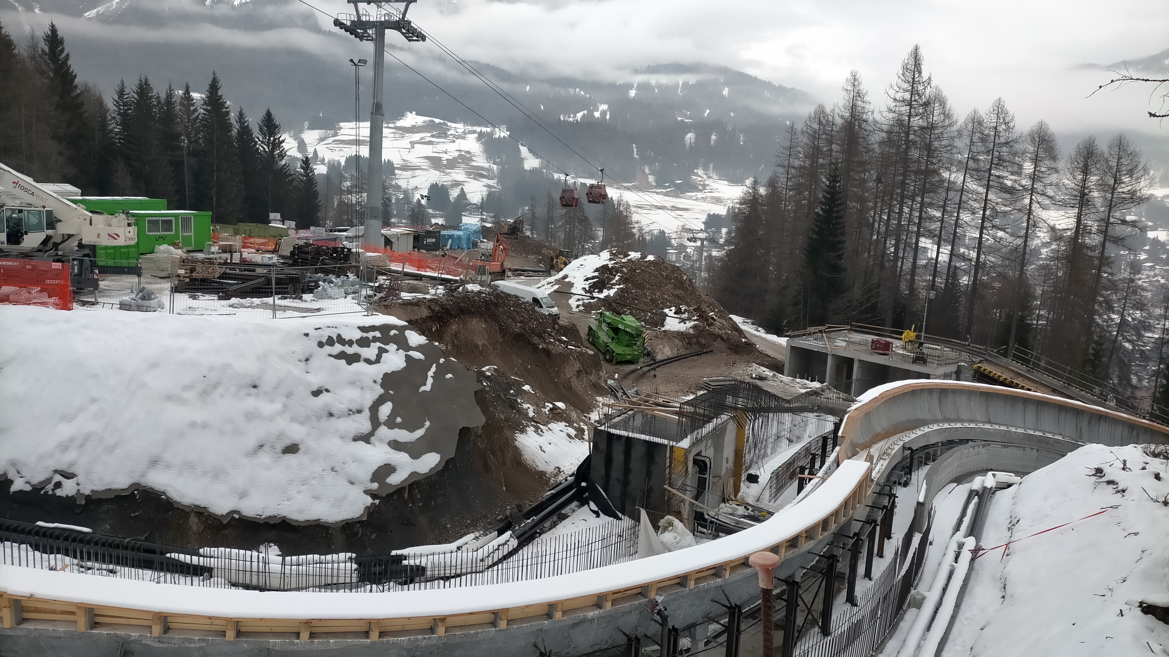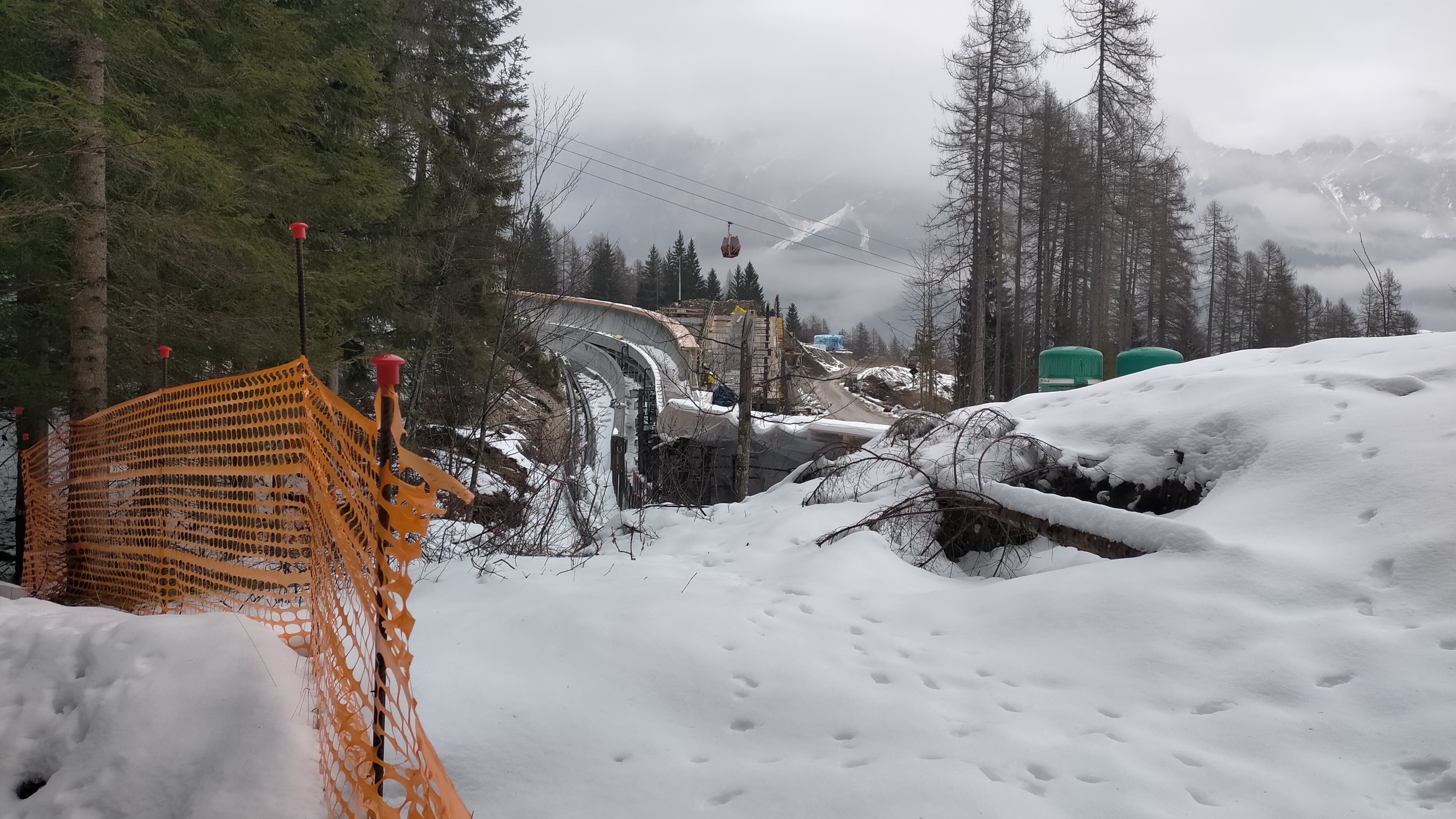 «La pista è pronta. Ma neanche per sogno! Diversi larici e altri alberi d’alto fusto abbattuti successivamente nelle zone ai confini della recinzione che non sono entrati nel conteggio ufficiale dell’abbattimento. Cantieri che mostrano latenti ritardi negli apparati di sicurezza necessari alla pre-omologazione, come passerella laterale di sicurezza emergenza e servizi accessori di controllo della discesa. Solo il budello di cemento procede, ma è completato per metà! (altro che finito) con coperture posticce e materiali lasciati alle intemperie. Sbreghi di terra, detriti, ovunque, con gettate di calcestruzzo e materiali impermeabilizzanti a contenere franamenti vari. Alberi pericolanti che incombono sul tracciato. Un disastro! per una pista tutta armata di acciaio, senza più un briciolo che sia uno del tracciato disegnato sulla naturale conformazione del terreno. Distrutta completamente la pista storica. Sparita l’Eugenio Monti. Oggi pioggia mista a neve per tutta la giornata».