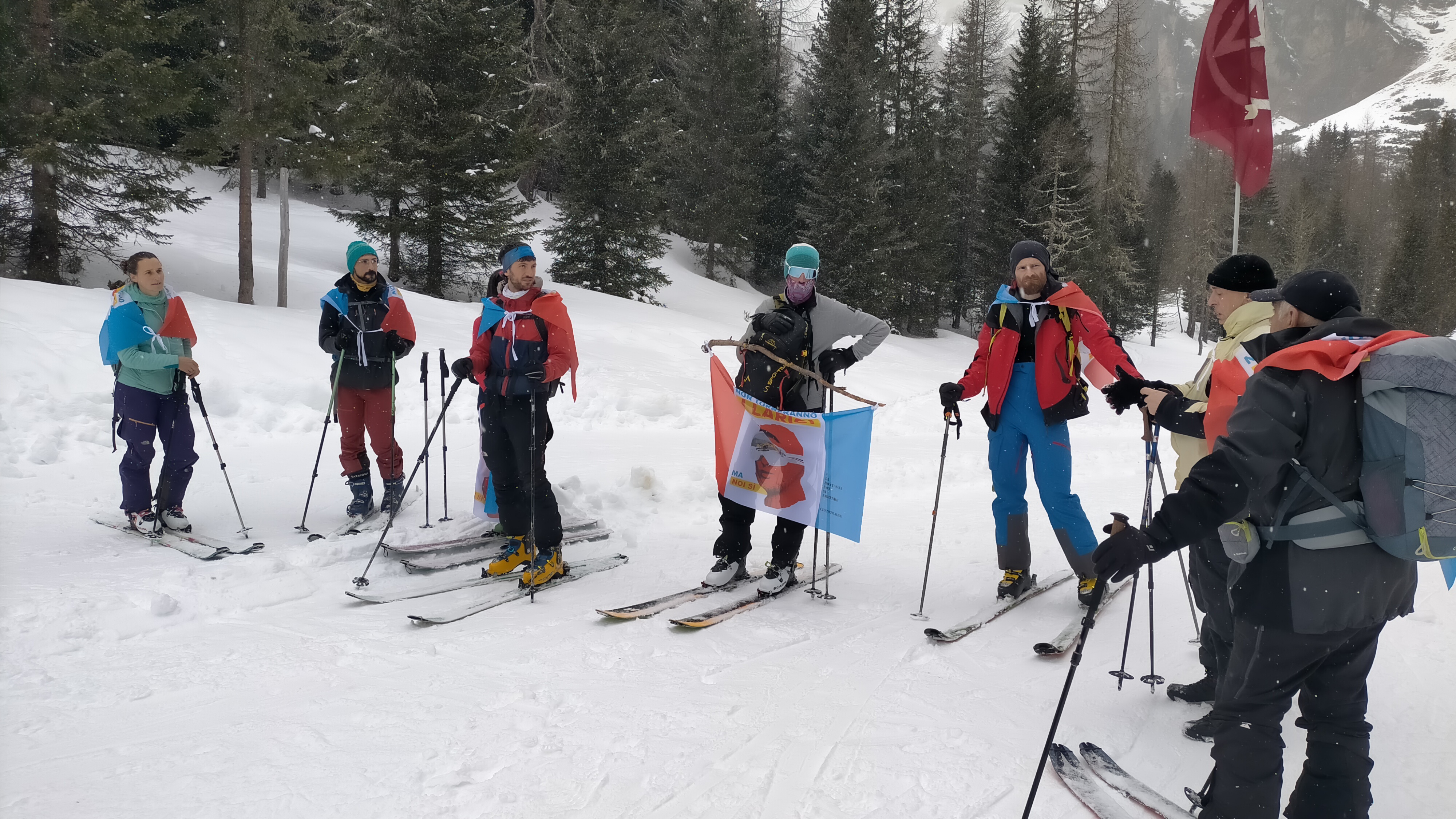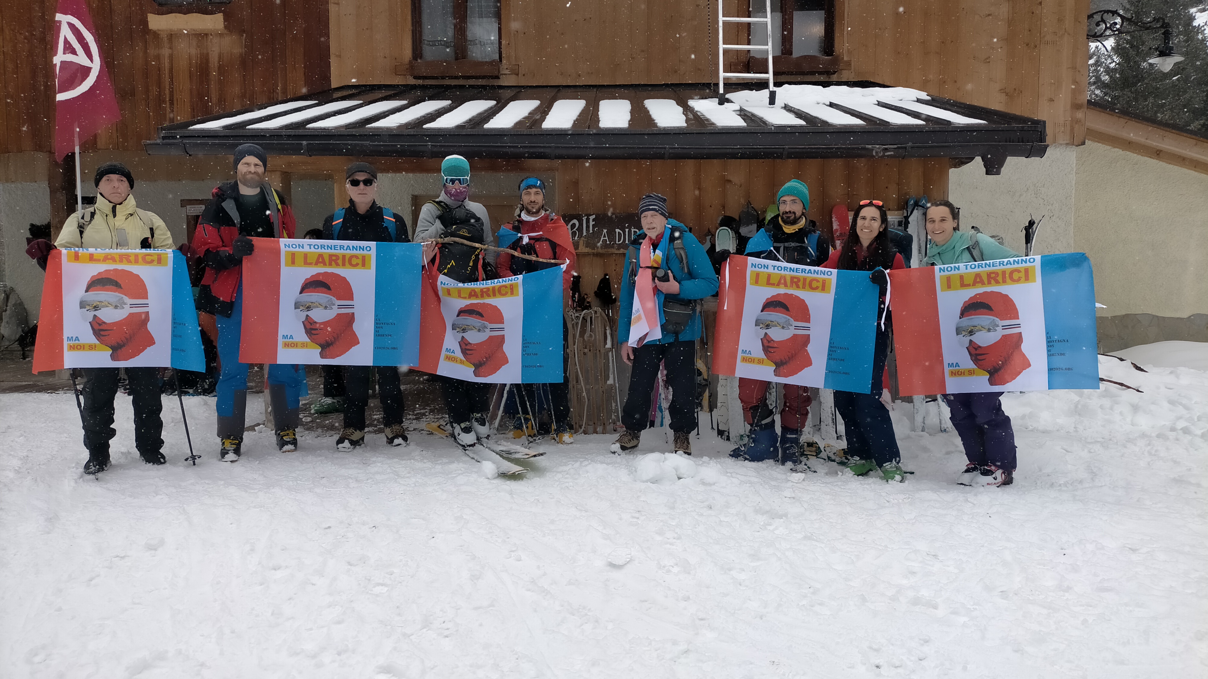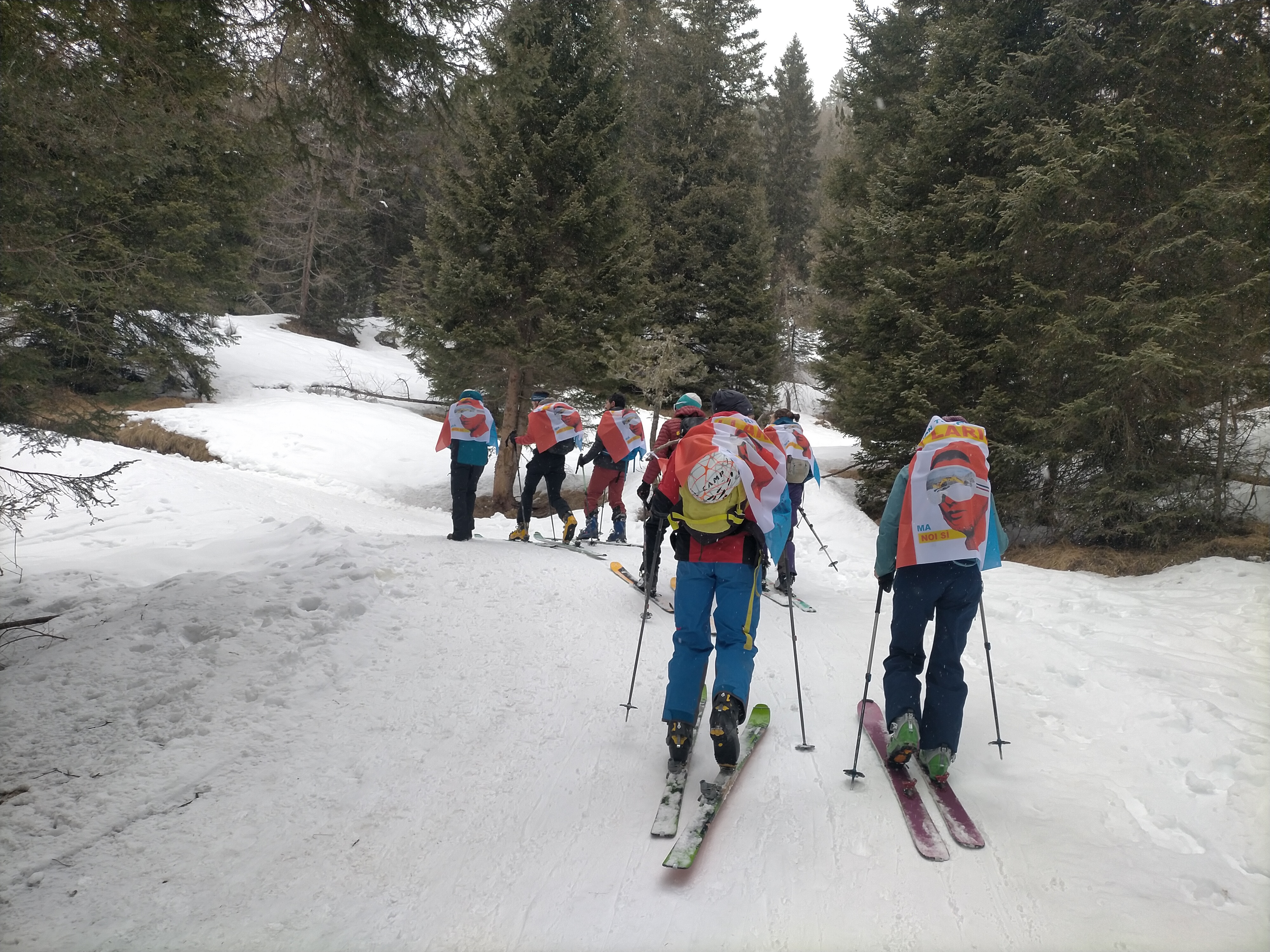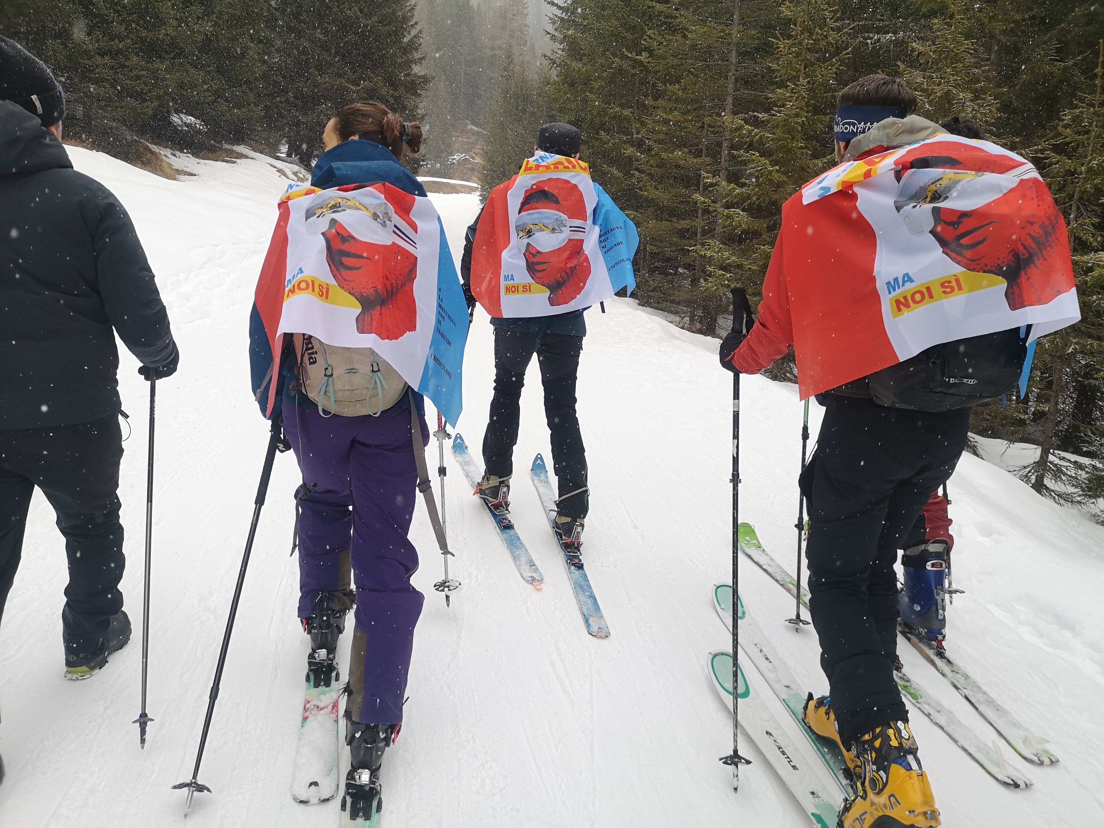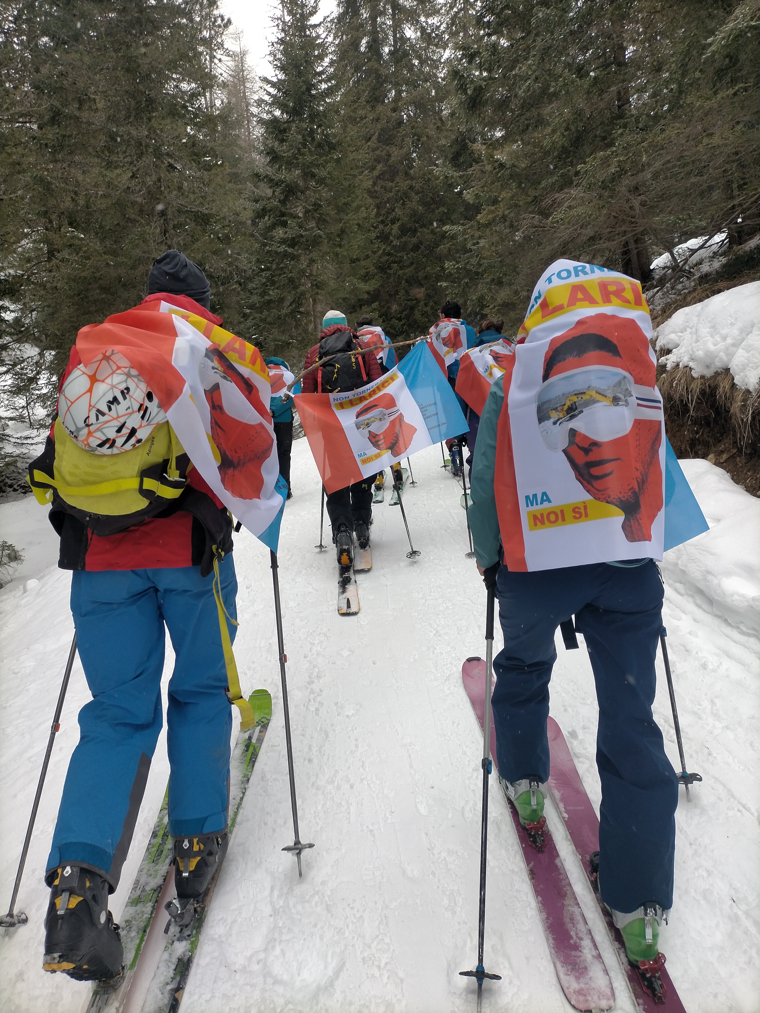 PS le bandiere NTIL sono state applicate in modo gentile e spontaneo da vari attivisti incontrati lungo il percorso, sotto lo sguardo di autorità di varia natura. Compresa la natura del bosco. Si possono togliere gentilmente senza ricorrere a tribunali di stato. Basta chiedere gentilmente. Sciogliendo i nodi. Fisici e simbolici. Che le hanno legate ai rumori del vento. Ai nostri sci. Lasciamo i giudici e gli inquirenti a lavorare contro gli autentici crimini contro la comunità.