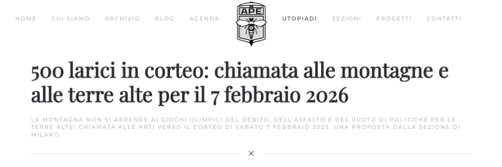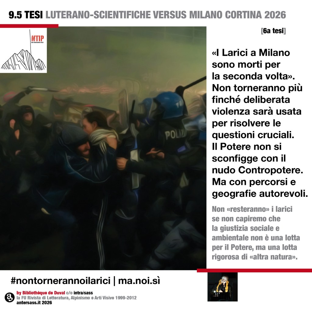 Questo l’incipit: ««I larici a Milano sono morti per la seconda volta?» – domando. Il 7 febbraio 2026 l’astratto ed efficace simbolismo del corteo si è scontrato con scelte, fatti globali e scontri concreti. Segue una breve cronaca e considerazioni a margine del grande evento “antiolimpico”. Un momento sicuramente indelebile per la città. Nel bene e nel male di queste Olimpiadi. Un successo come partecipazione e pluralità di voci e rivendicazioni. Notevole la performance iniziale. Tuttavia, per altra via, a mio parere, nel finale un’occasione persa per allargare la frattura sulla crepa olimpica. E sulla tossicità che essa nasconde, per trascinare il resto. Per produrre la faglia: una narrazione e un’azione definitivamente contraria» leggi tutto >> [1].