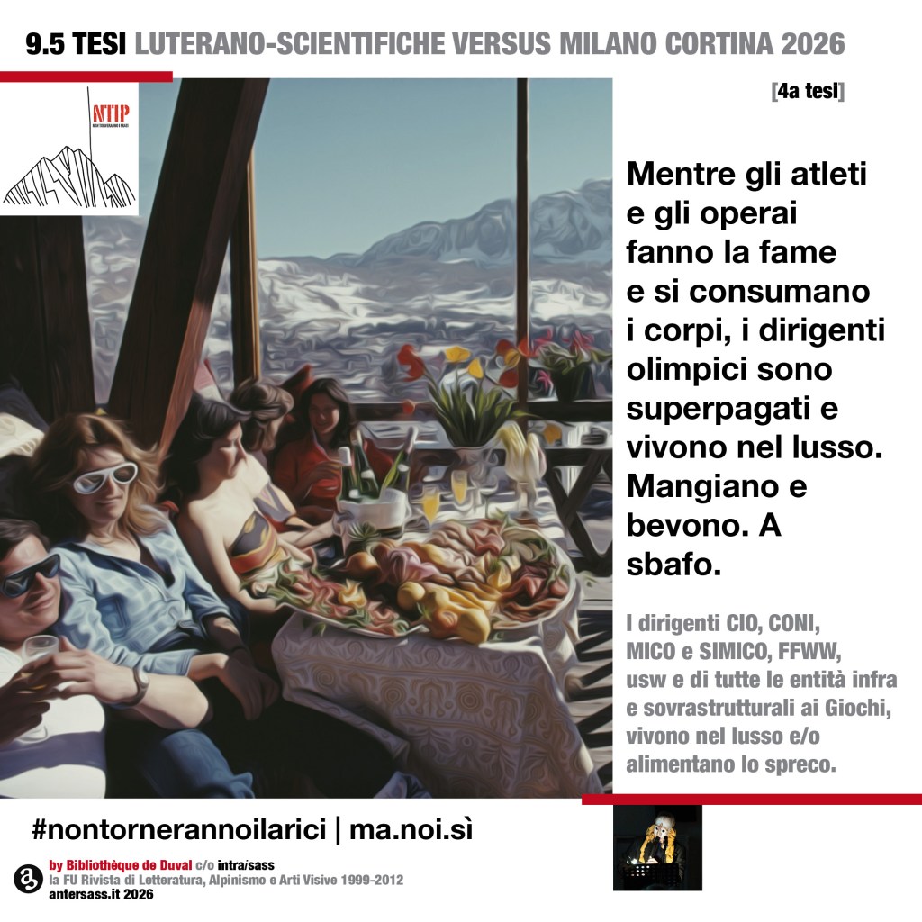 Insomma, tra Milano e Cortina, soprattutto tra l’ingolfata [9] Ale-magna – qui-se-magna, il magnar veneto – una moltitudine di persone dormono e mangiano a sbafo di tutti i contribuenti. Di tutte le nazioni. Essendo queste Olimpiadi un banchetto planetario dove gli scarti fisici e climatici sono a carico del pianeta intero. E lo sport, quello vero, nell’accezione della premessa delle nostre Tesi, pochi lo praticano e a pochi importa. Il magnar-sodo-e-a-sbafo è diventato il vero sport olimpico di queste Olimpiadi Tardoclimatiche.