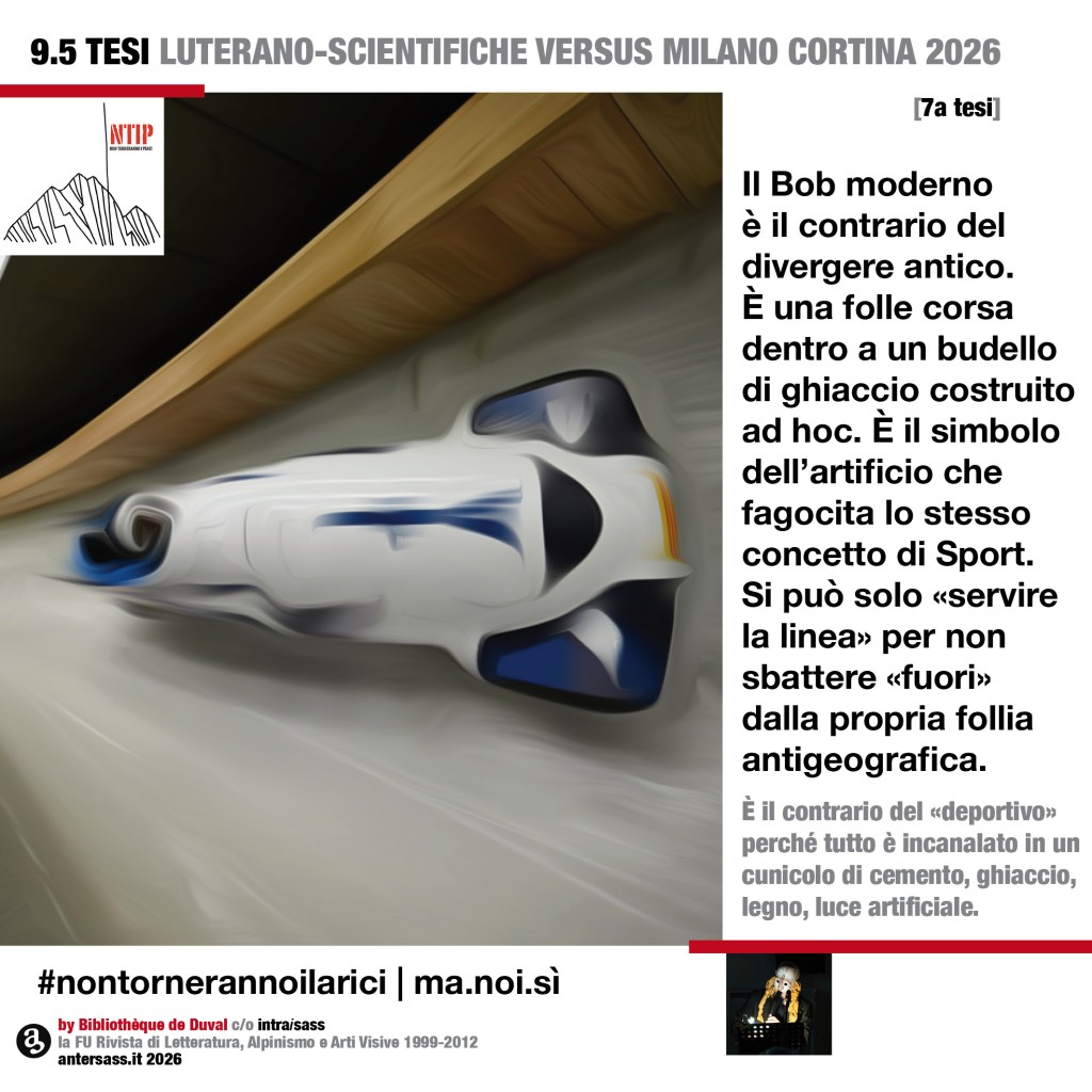 Il Bob moderno è il contrario del divergere antico. È una folle corsa dentro a un budello di ghiaccio costruito ad hoc. È il simbolo dell’artificio che fagocita lo stesso concetto di Sport. Si può solo «servire la linea» per non sbattere «fuori» dalla propria follia antigeografica.