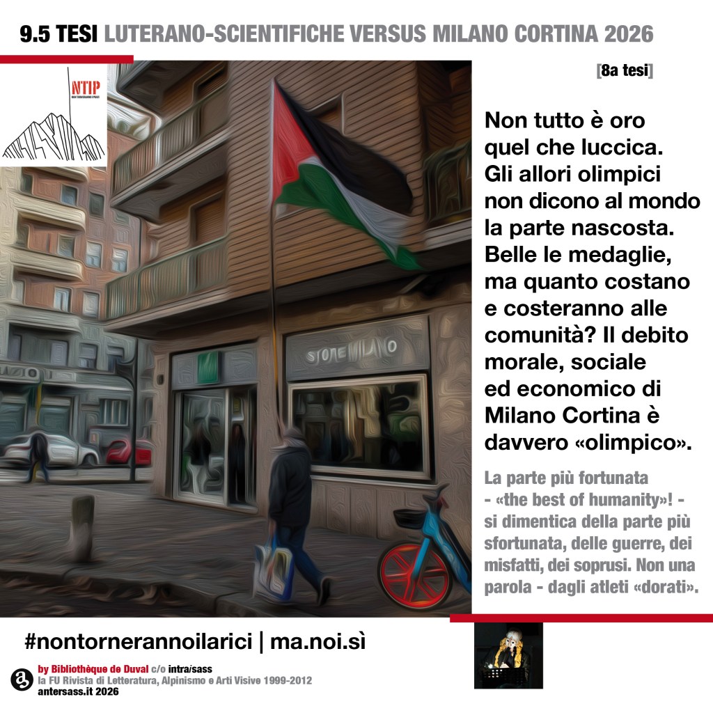 Divulgate queste tesi, per rompere la falsa narrazione di queste Olimpiadi Tardoclimatiche, per liberare lo spirito olimpico dalle gabbie in cui è stato incarcerato, usurpato dai Sacerdoti del Soldo e degli Apparati Burocratici Nazionali. Dal Signore degli Appalti. Dal Dio Fascista del Denaro, che tutto fascia. Esautoriamo queste Olimpiadi, come fece Lutero per la Chiesa corrotta, ma senza essere luterani. La libertà di pensiero e di critica non segue alcuna dottrina. Segue l’emergere dei fatti e resta fedele solo alla lateralità del nostro essere figli della terra. Di Una Terra. Tutti: indigeni, senza bandiere, senza privilegi, senza interessi, se non la dignità di essere presenti. A se stessi e agli altri. In opposizione a questo schifo di mondo messo in opera dalla finanza e dalla competizione tout court, che brucia e consuma pure il corpo e l’anima degli atleti. Oltre che la psiche degli spettatori. «La nostra vita non è un gioco» [5]. Sporco.