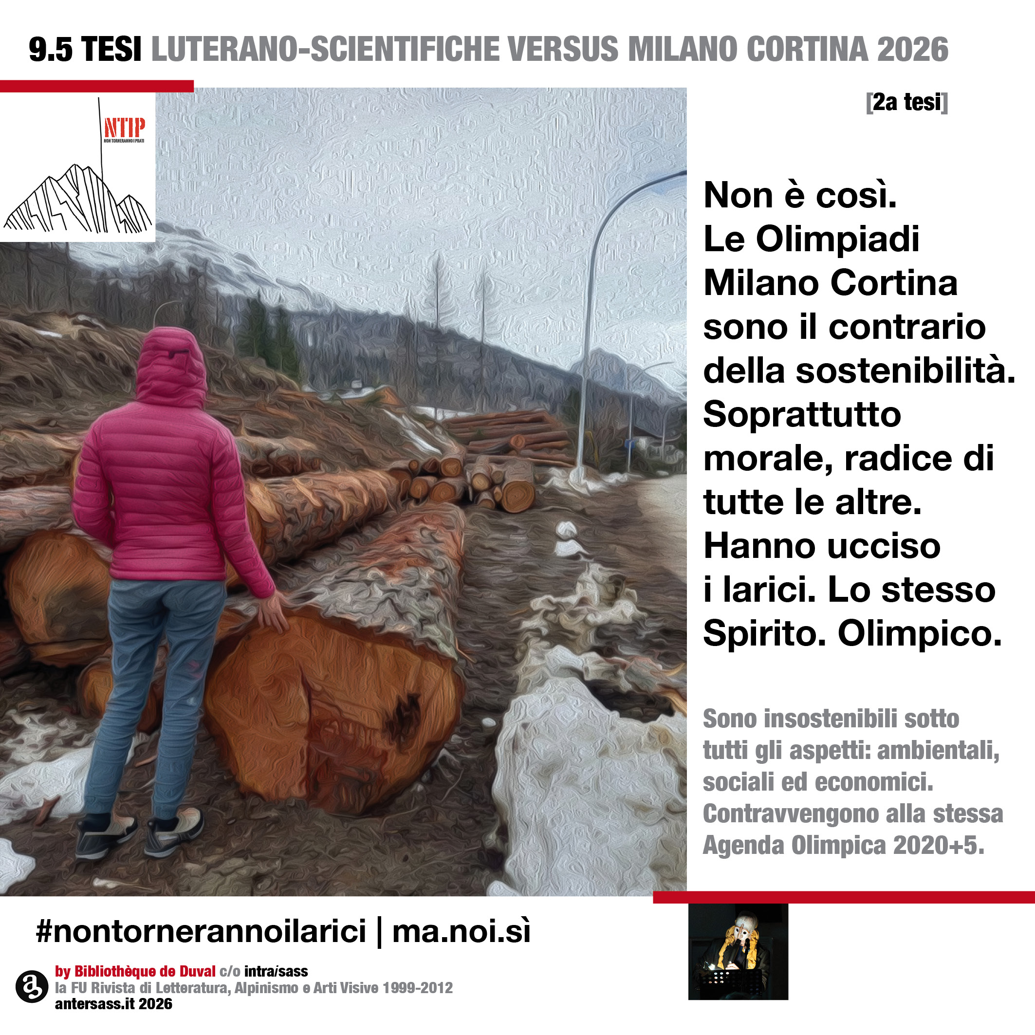 Non è così. Le Olimpiadi Milano Cortina sono il contrario della sostenibilità. Soprattutto morale, radice di tutte le altre. Hanno ucciso i larici. Lo stesso Spirito. Olimpico.