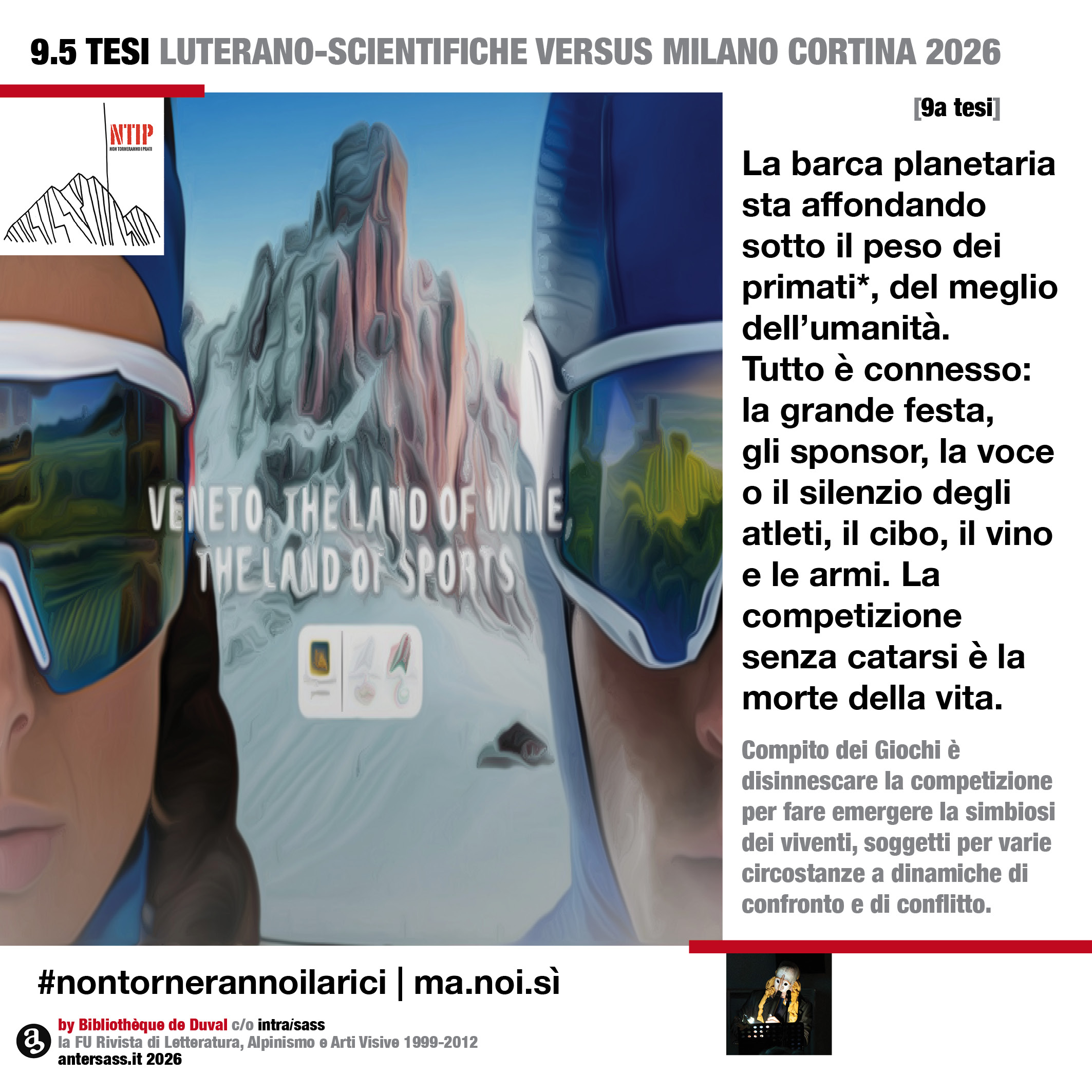 Insomma, tra Milano e Cortina, soprattutto tra l’ingolfata [9] Ale-magna – qui-se-magna, il magnar veneto – una moltitudine di persone dormono e mangiano a sbafo di tutti i contribuenti. Di tutte le nazioni. Essendo queste Olimpiadi un banchetto planetario dove gli scarti fisici e climatici sono a carico del pianeta intero. E lo sport, quello vero, nell’accezione della premessa delle nostre Tesi, pochi lo praticano e a pochi importa. Il magnar-sodo-e-a-sbafo è diventato il vero sport olimpico di queste Olimpiadi Tardoclimatiche.