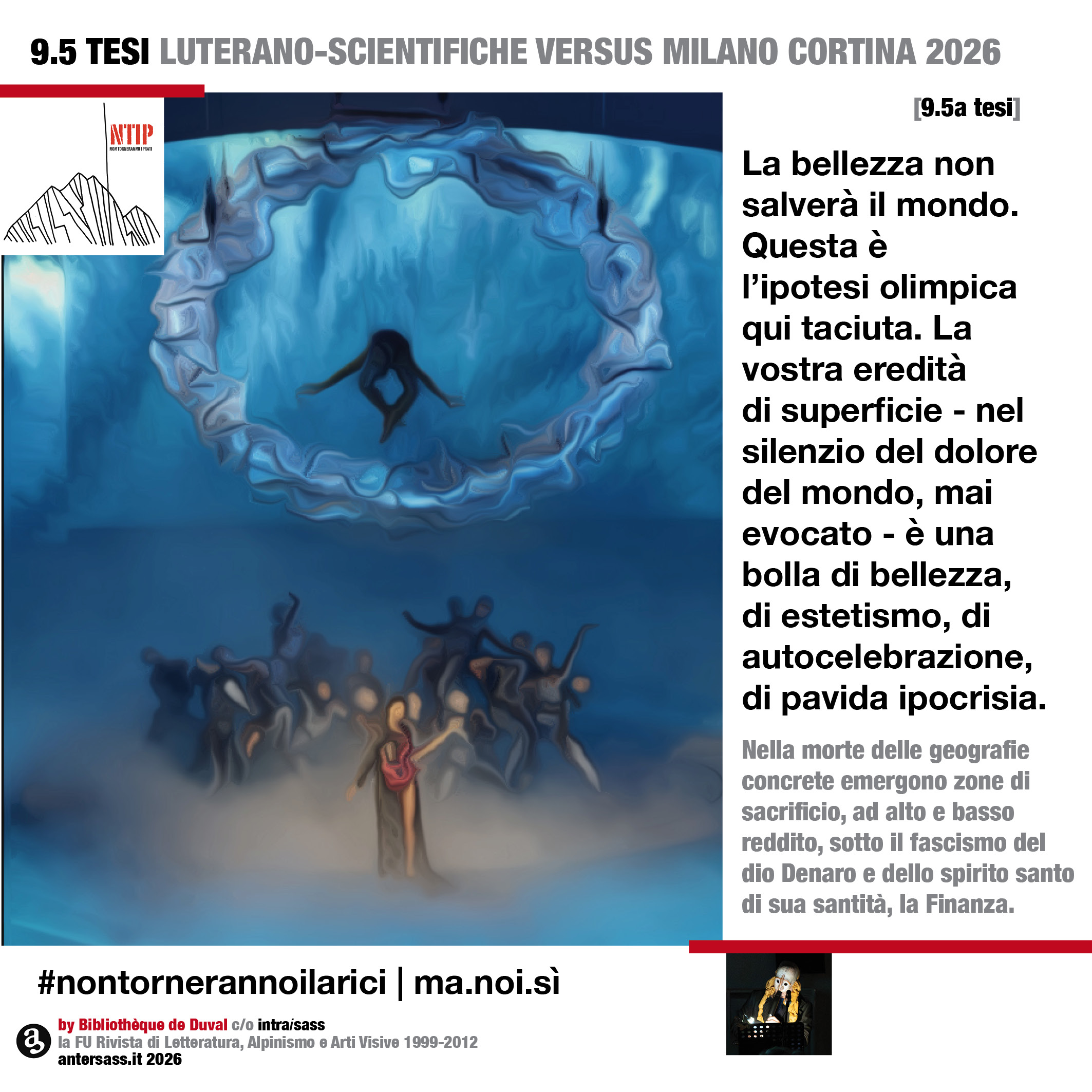 Divulgate queste tesi, per rompere la falsa narrazione di queste Olimpiadi Tardoclimatiche, per liberare lo spirito olimpico dalle gabbie in cui è stato incarcerato, usurpato dai Sacerdoti del Soldo e degli Apparati Burocratici Nazionali. Dal Signore degli Appalti. Dal Dio Fascista del Denaro, che tutto fascia. Esautoriamo queste Olimpiadi, come fece Lutero per la Chiesa corrotta, ma senza essere luterani. La libertà di pensiero e di critica non segue alcuna dottrina. Segue l’emergere dei fatti e resta fedele solo alla lateralità del nostro essere figli della terra. Di Una Terra. Tutti: indigeni, senza bandiere, senza privilegi, senza interessi, se non la dignità di essere presenti. A se stessi e agli altri. In opposizione a questo schifo di mondo messo in opera dalla finanza e dalla competizione tout court, che brucia e consuma pure il corpo e l’anima degli atleti. Oltre che la psiche degli spettatori. «La nostra vita non è un gioco» [5]. Sporco.