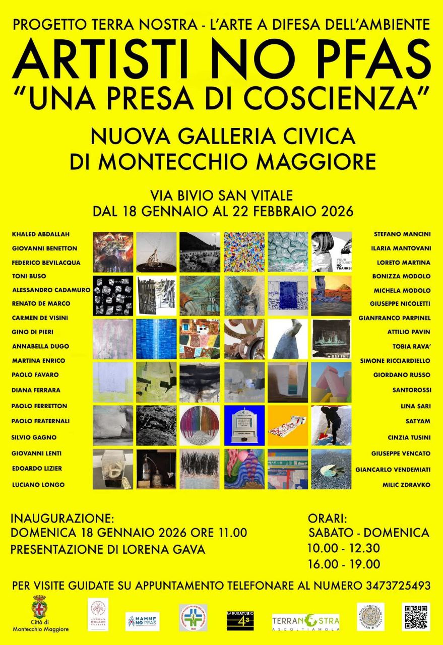 Non è la prima volta che gli artisti e l’arte parlano di Pfas. Ma è la prima grande collettiva (36 artisti!) in un luogo davvero topico dove mai nessuno avrebbe pensato di arrivare e di esporre, tanto è coinvolto, nel bene e nel male, il Comune di Montecchio Maggiore. Solo una vera e propria «Presa di coscienza» nell’epicentro del sistema? Forse qualcosa di più: la forza e l’insubordinazione dell’arte! Che agisce e occupa gli spazi fisici e simbolici irragiungibili per il potere.